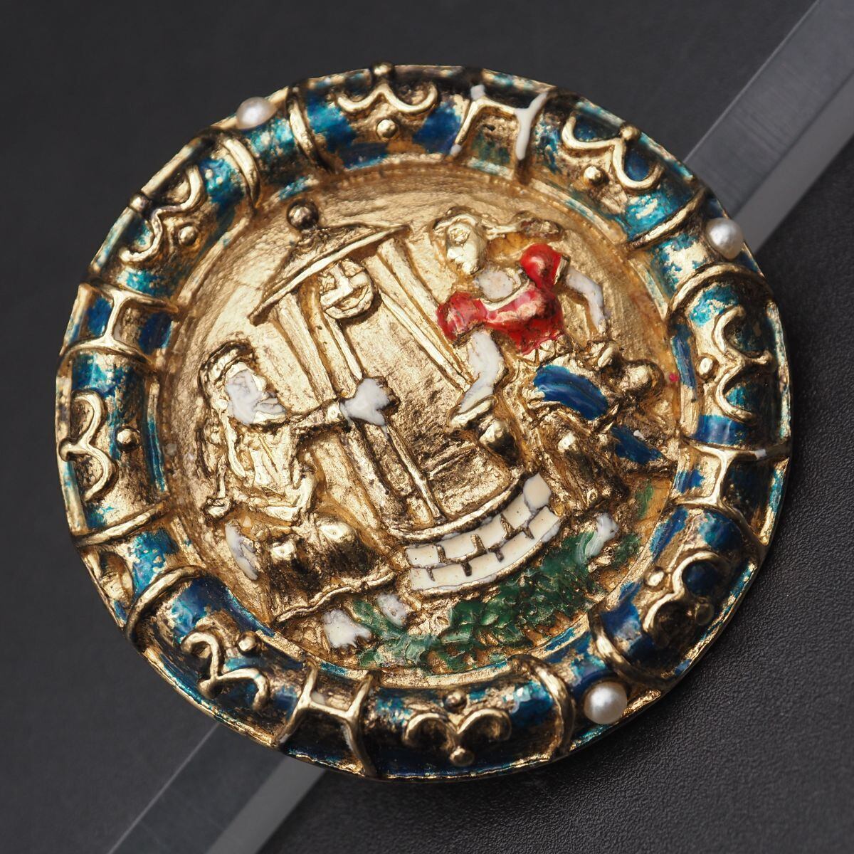 B456 ブローチ 大ぶり 男性 女性 井戸? フェイクパール ゴールド デザイン コスチュームジュエリー