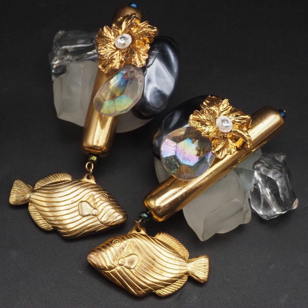 C110 特大 イヤリング 魚 フィッシュ ダイヤモンド風 クリスタル風 フェイクパール ゴールド スウィング デザイン コスチュームジュエリー
