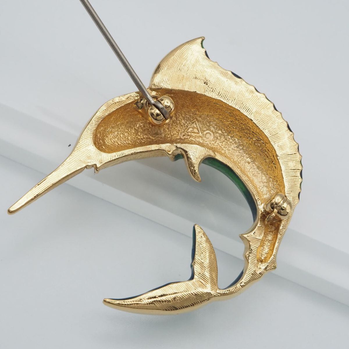 C216 ブローチ 魚 フィッシュ ラインストーン グリーン ブルー エナメル ゴールド デザイン コスチュームジュエリー