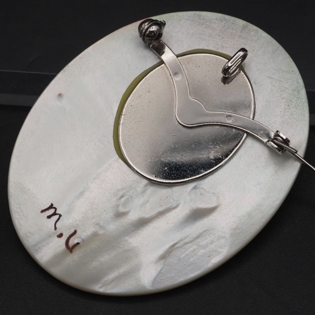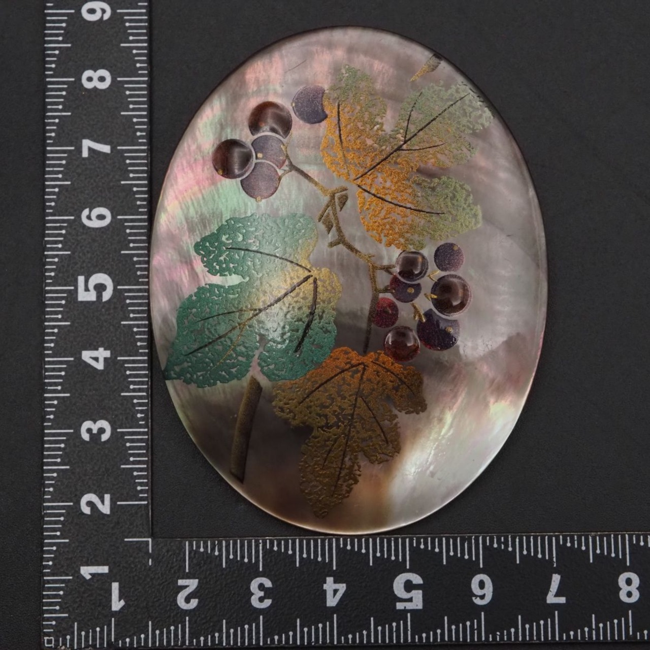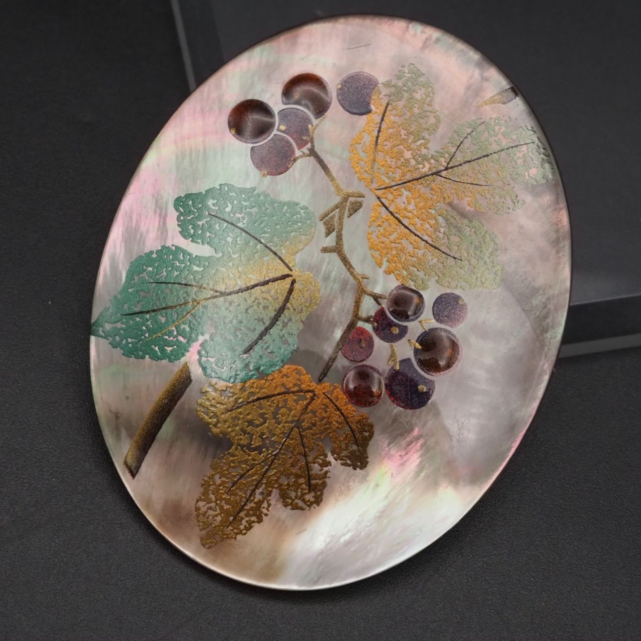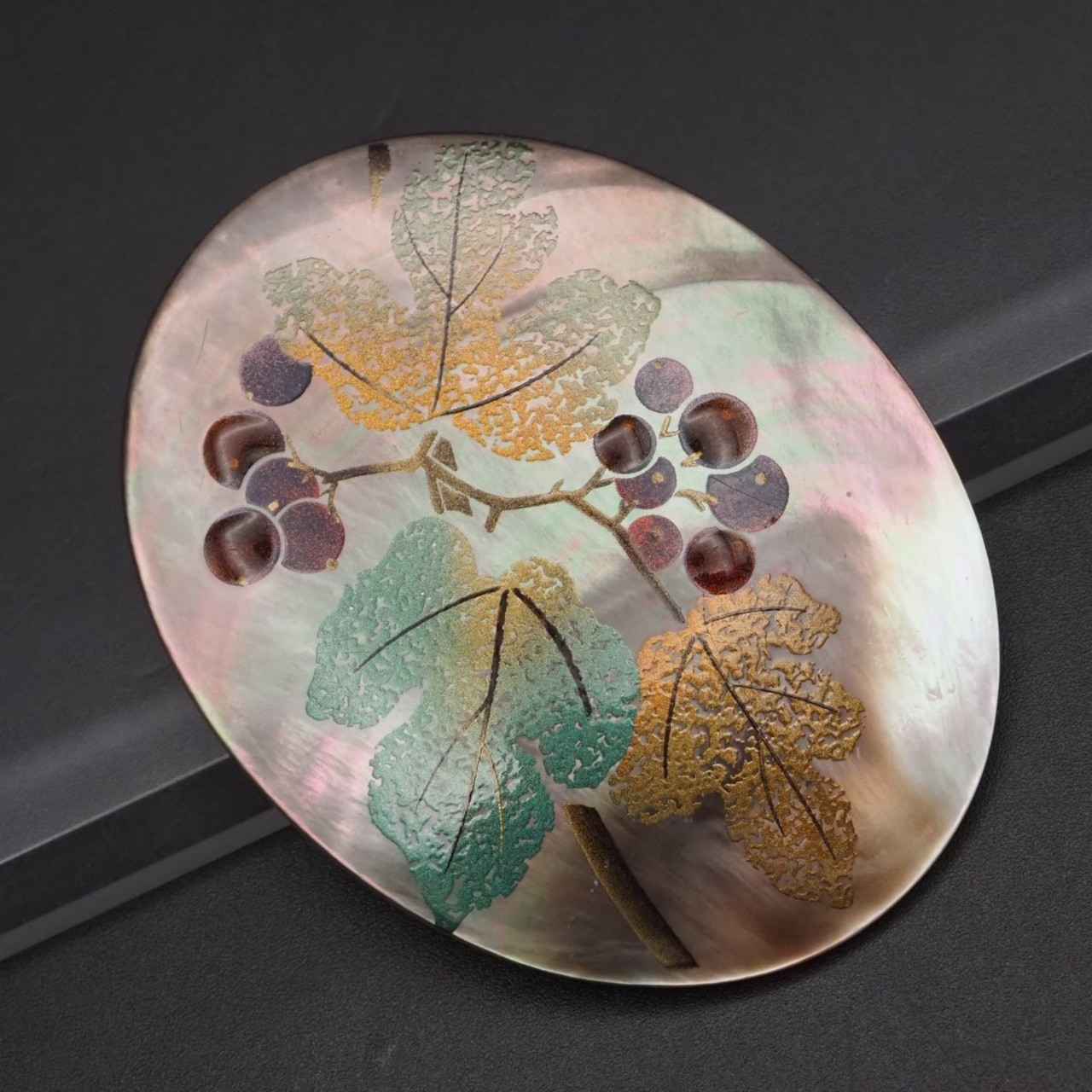 F913 シェル 作家物 m.u刻印 ブローチ 大ぶり 金彩蒔絵 果実 リーフ デザイン