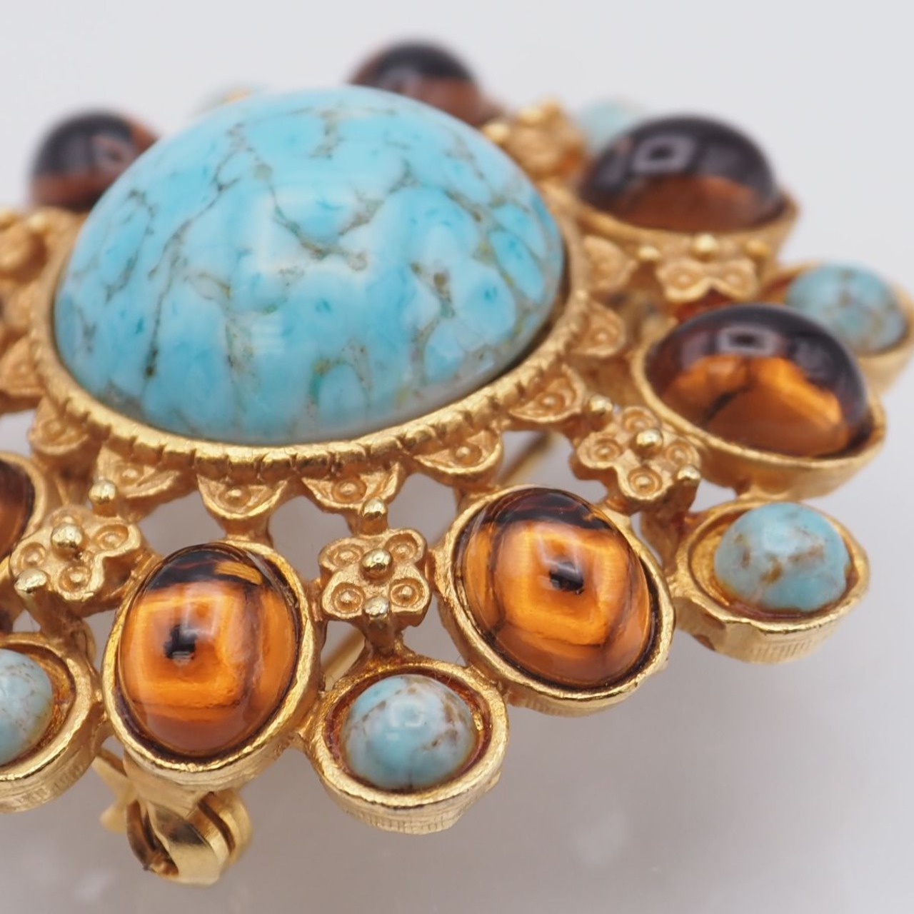 G183 ブローチ ブルーガラス カラーストーン風 ゴールド デザイン コスチュームジュエリー