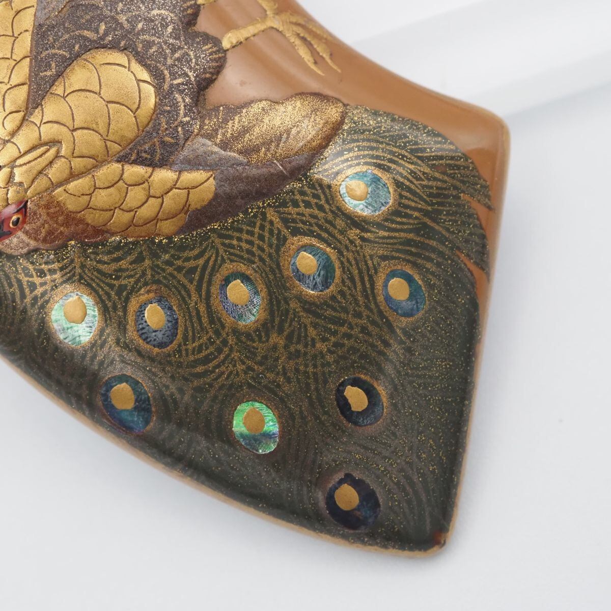 C403 輪島塗 恵悦作 帯留め 金彩蒔絵 螺鈿細工 漆塗り 孔雀 クジャク モチーフ 和装小物