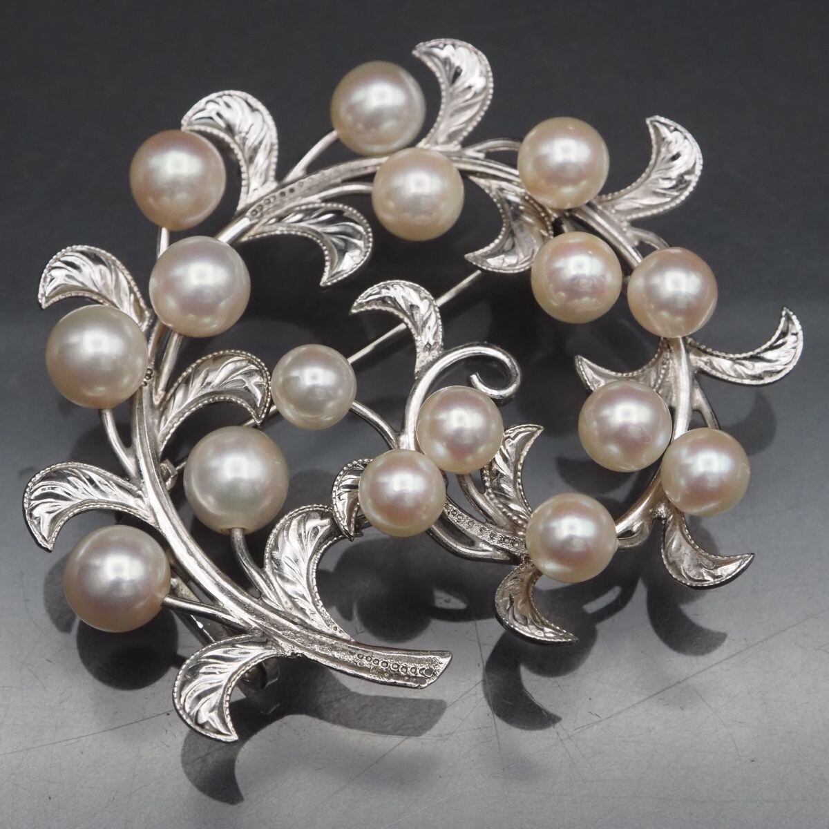 C774 本真珠 5.3-6.8mm16珠 パール STERLING刻印 2way ブローチ 帯留め リーフ デザイン シルバー コサージュ 和装小物 6月誕生石