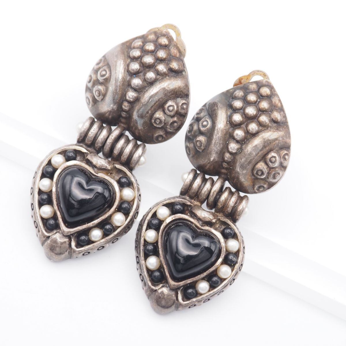 F679 イヤリング オニキス風 フェイクパール ハート スウィング デザイン シルバー コスチュームジュエリー