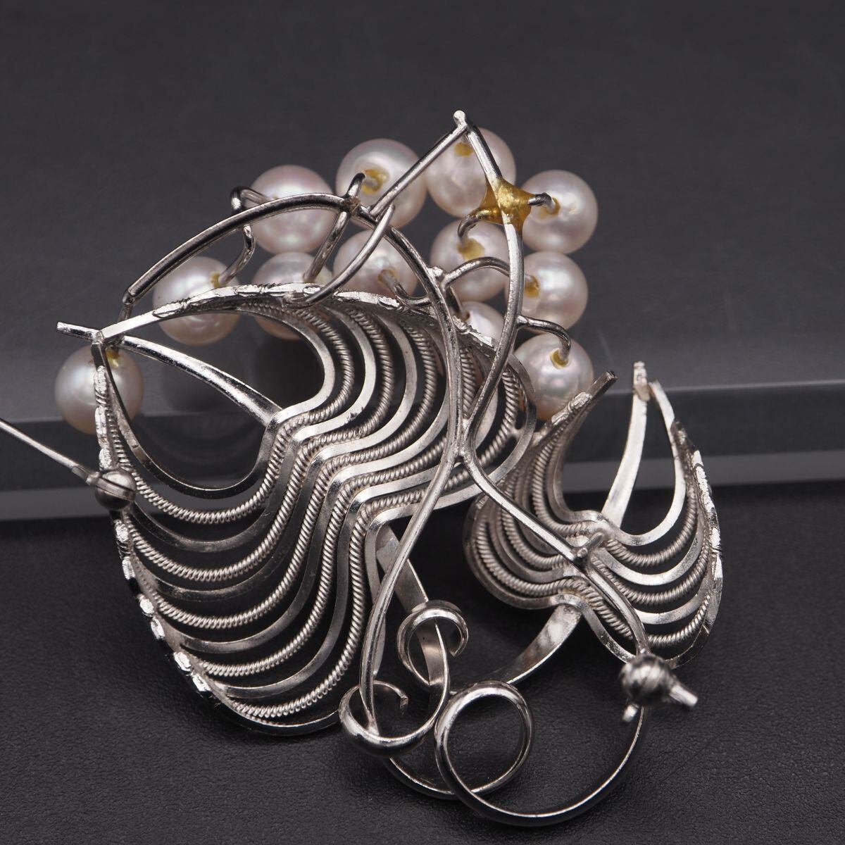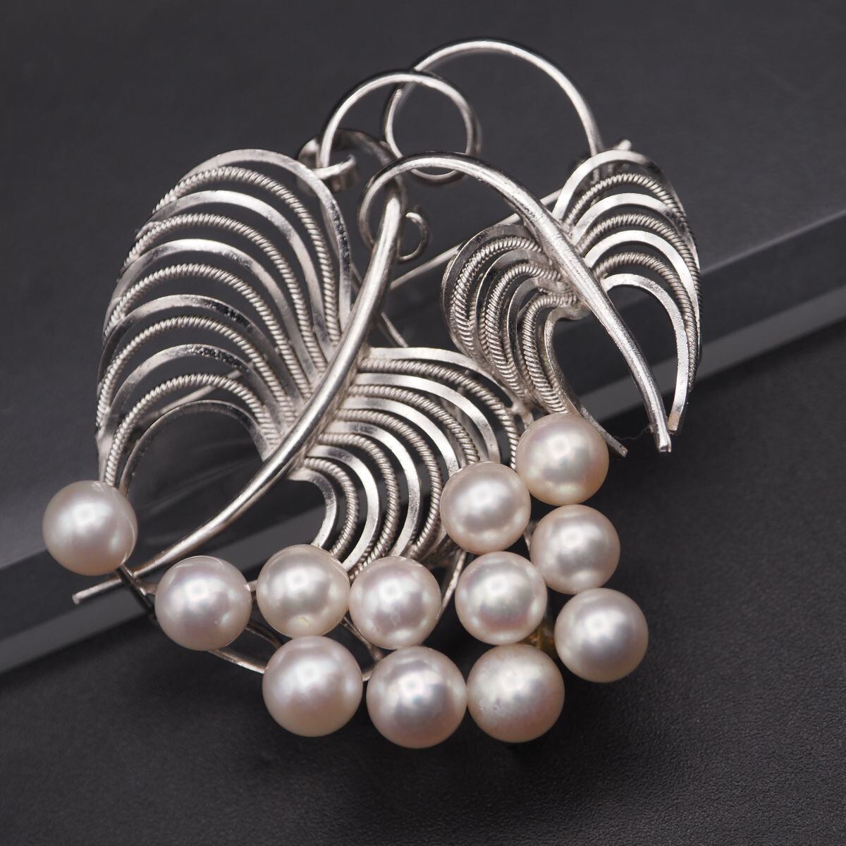 C275 本真珠 6.2~6.8mm12珠 パール 950.SILVER刻印 ブローチ リーフ デザイン シルバー コサージュ 6月誕生石