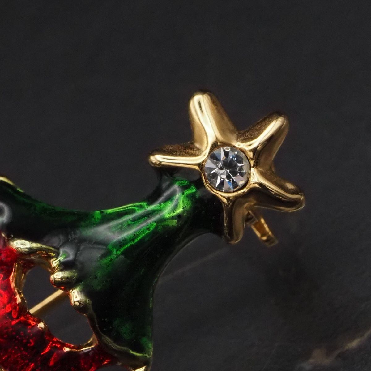G158 ブローチ クリスマスツリー スター グリーン レッド エナメル ゴールド デザイン コスチュームジュエリー