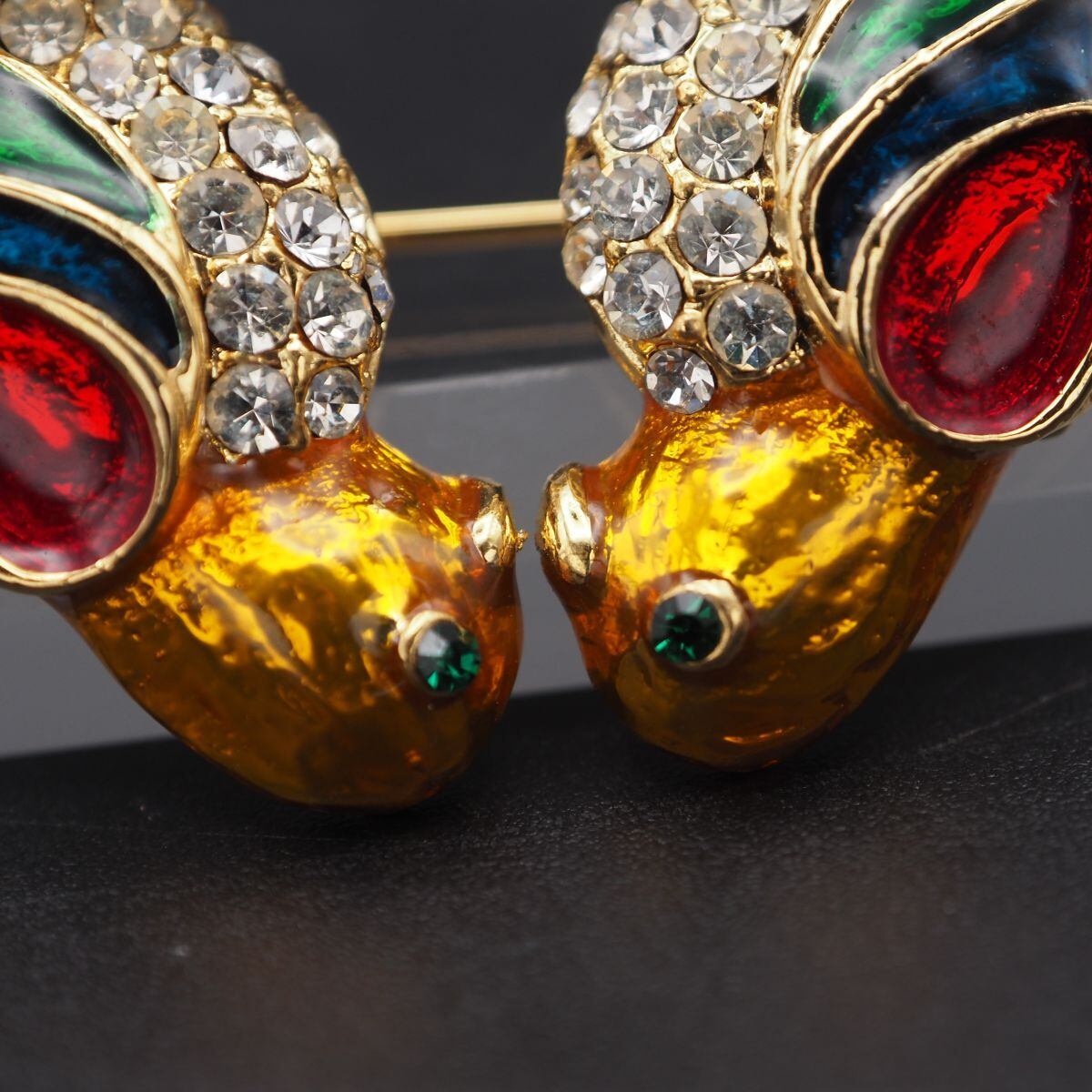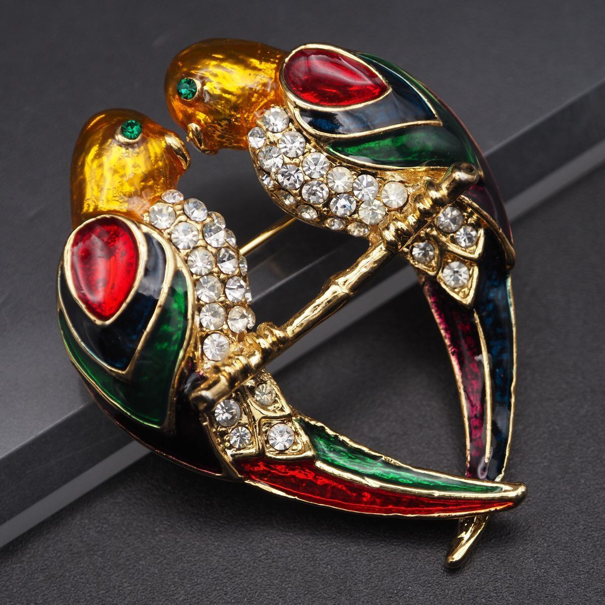 B870 ブローチ ラブバード 2羽の鳥 ラインストーン マルチカラー エナメル ゴールド デザイン コスチュームジュエリー