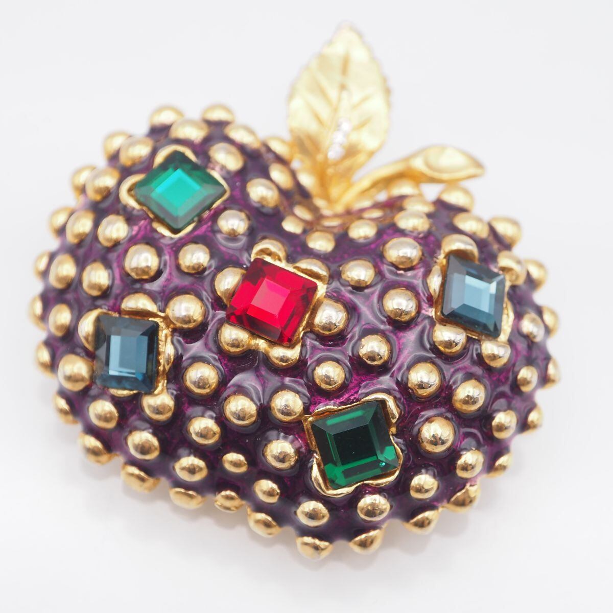C046 ブローチ リンゴ アップル カラーストーン風 マルチカラー パープルエナメル ゴールド デザイン コスチュームジュエリー