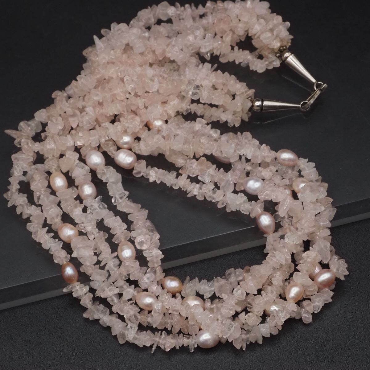 F023 ローズクォーツ 淡水真珠 パール 925刻印 ネックレス 5連 ピンク系カラー デザイン シルバー 6月誕生石