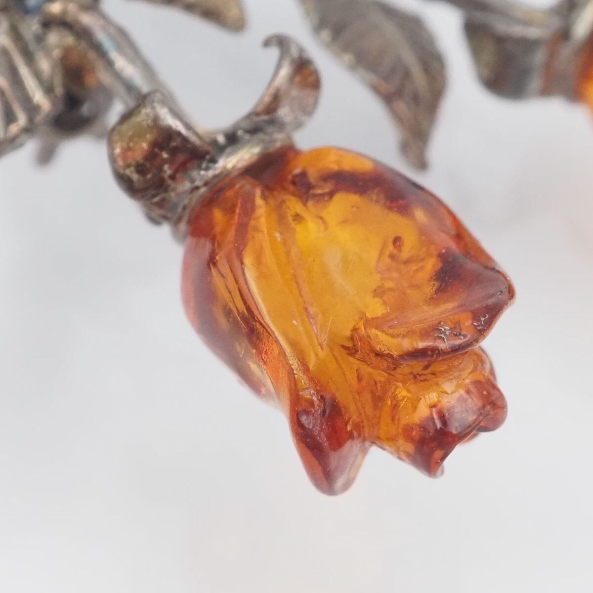 F456 琥珀 コハク アンバー 925刻印 ブローチ 薔薇 バラ ローズ デザイン シルバー ヴィンテージ
