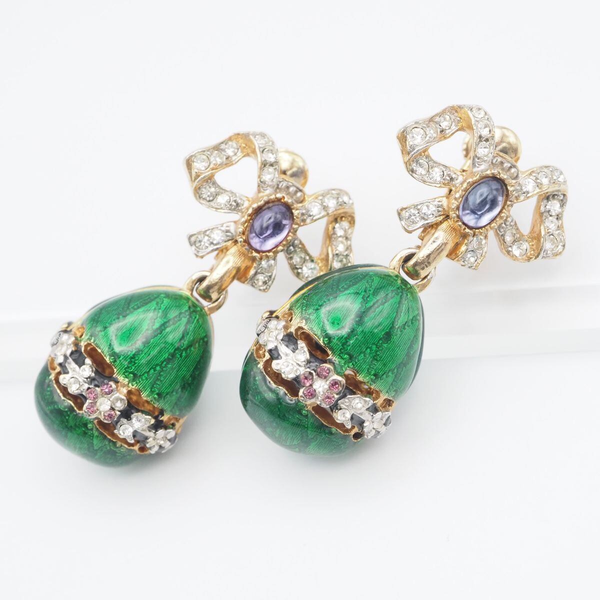 C439 CRAFT クラフト イヤリング アメジスト風 ラインストーン グリーンエナメル ゴールド スウィング デザイン