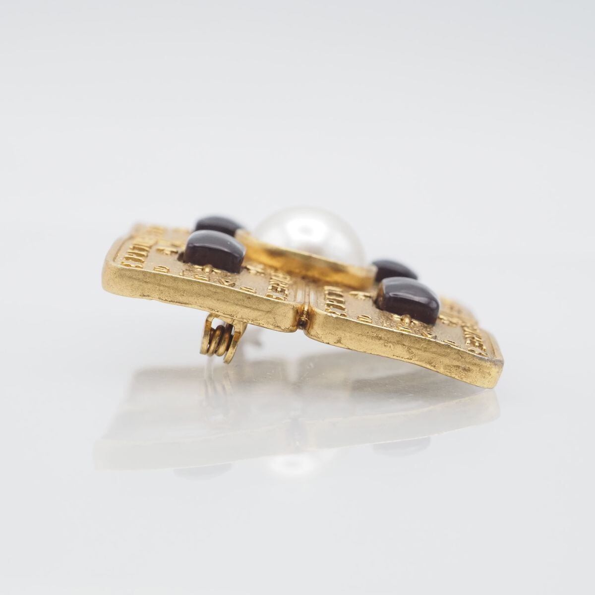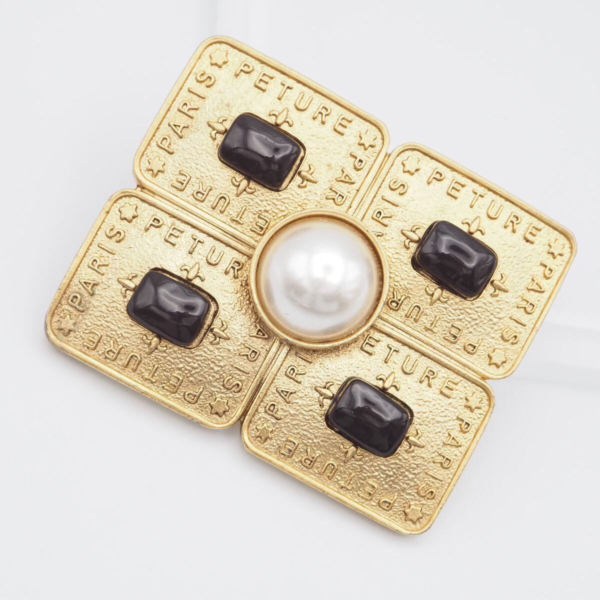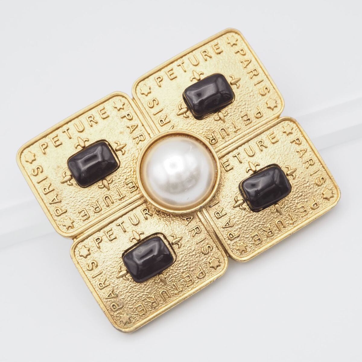 F072 PETURE PARIS ブローチ フェイクパール オニキス風 ロゴ ゴールド デザイン