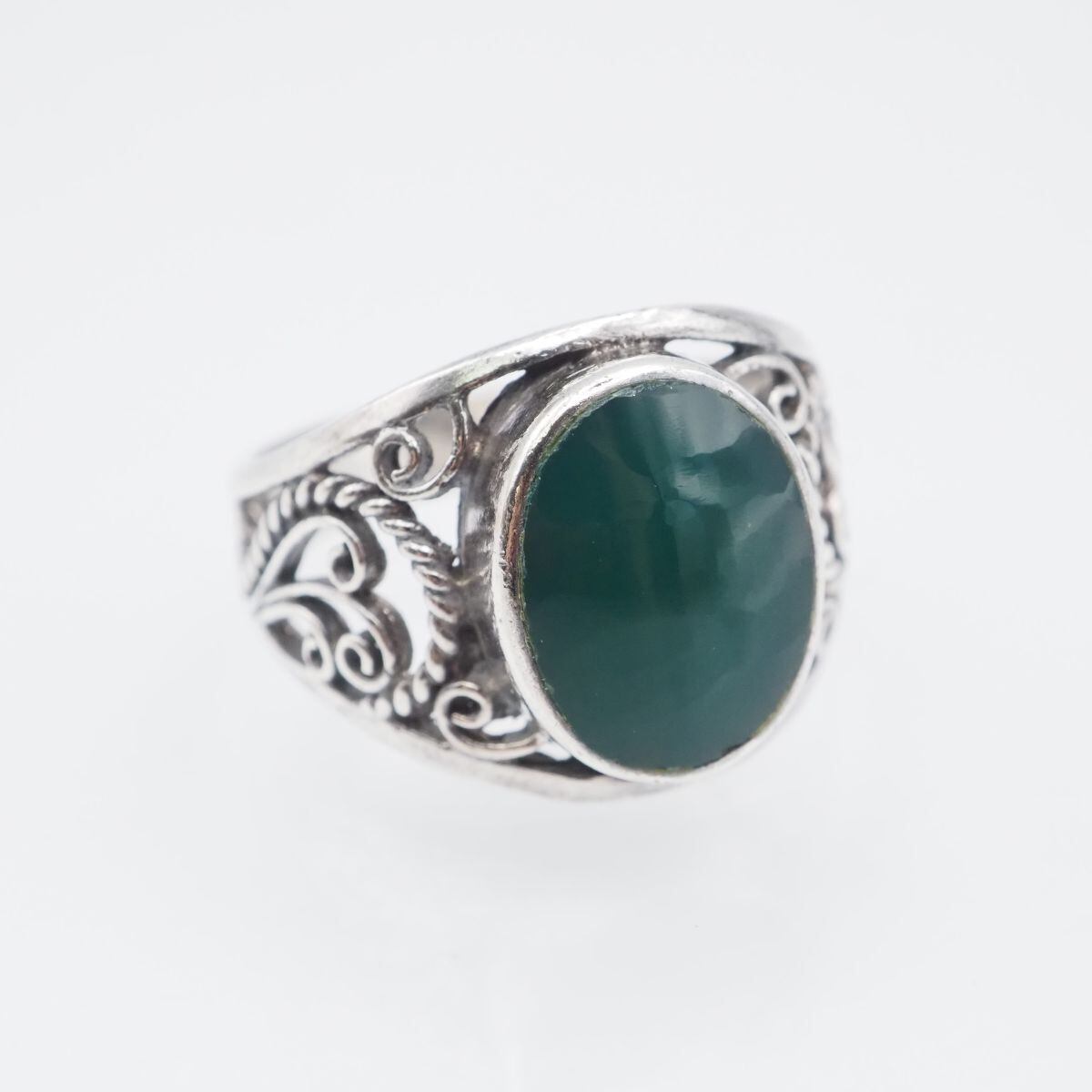 F809 グリーンアゲート風 925刻印 リング インレイ 透かし彫り デザイン シルバー 指輪 ヴィンテージ 12号