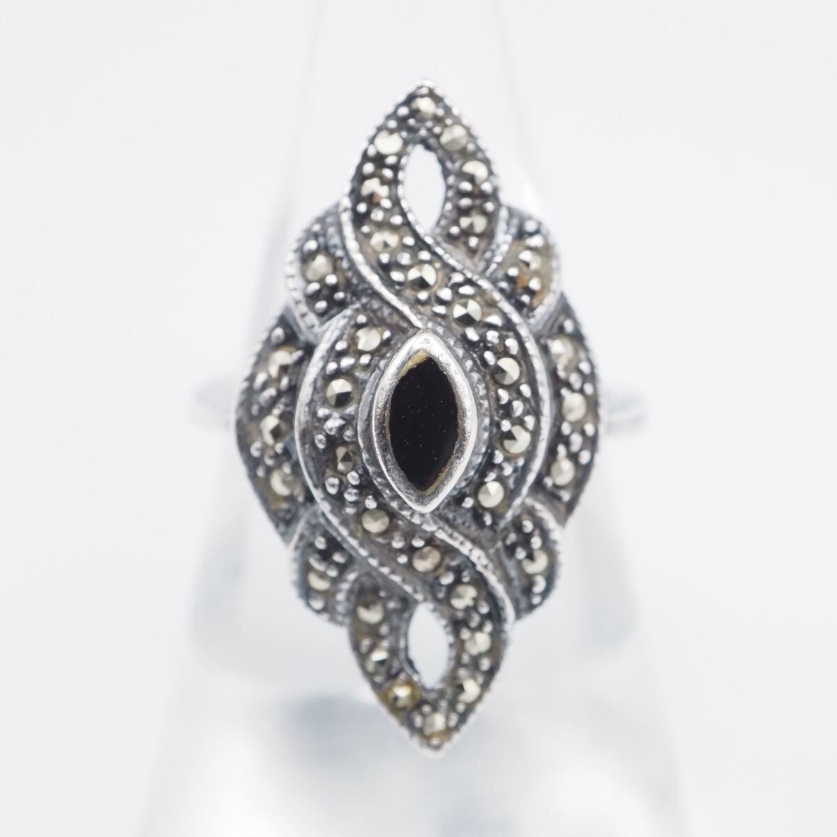 F804 オニキス風 マーカサイト マルカジット リング インレイ デザイン シルバー 指輪 ヴィンテージ 14号