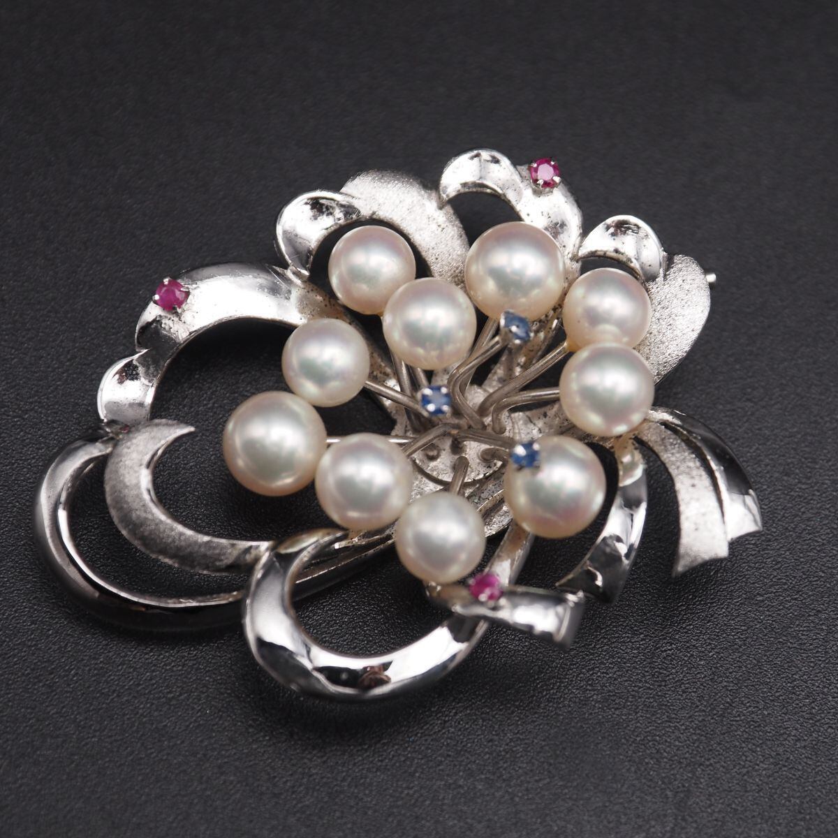 C361 本真珠 5.7-6.7mm10珠 パール サファイア? ルビー? スピネル? STERLING 930刻印 ブローチ デザイン シルバー コサージュ 6月誕生石