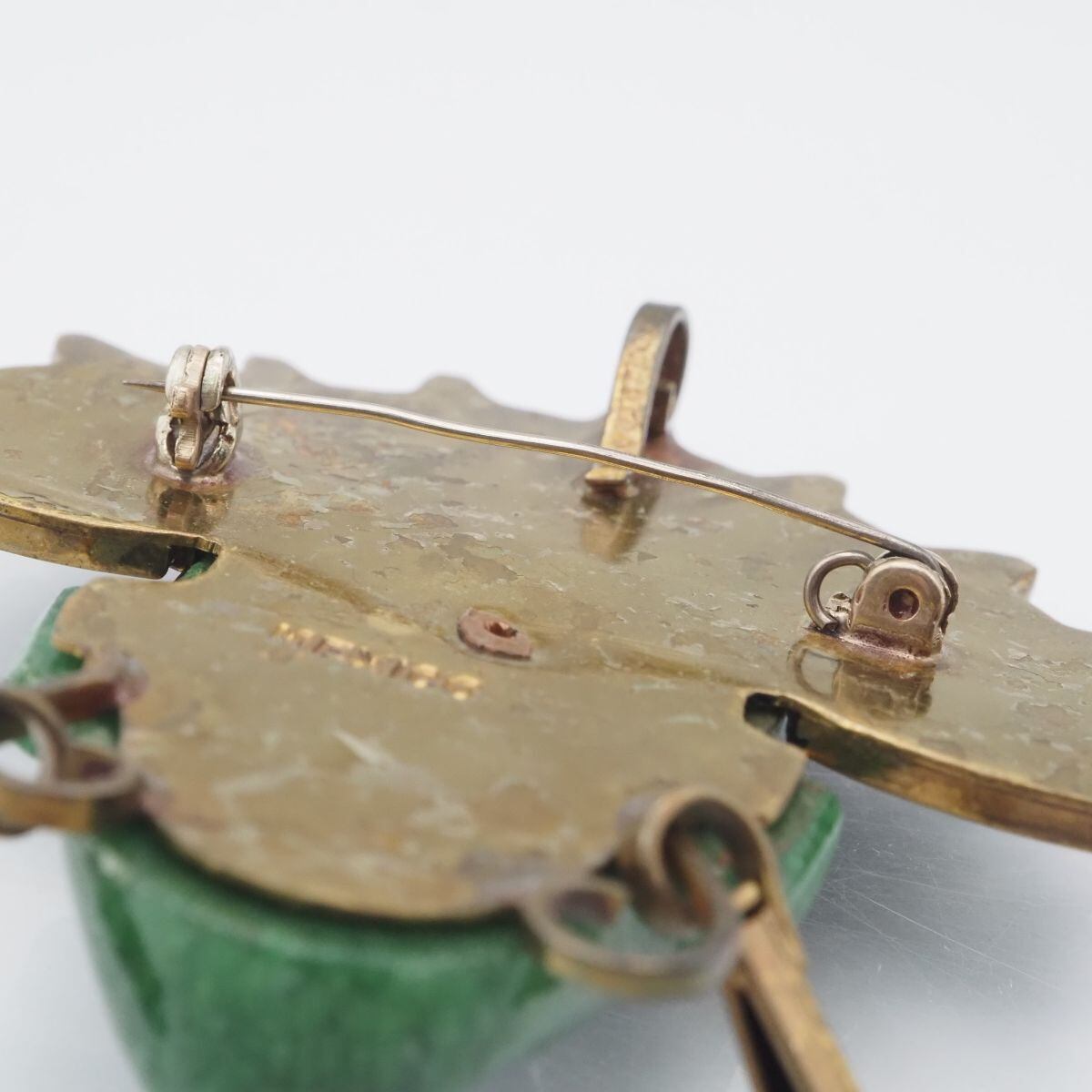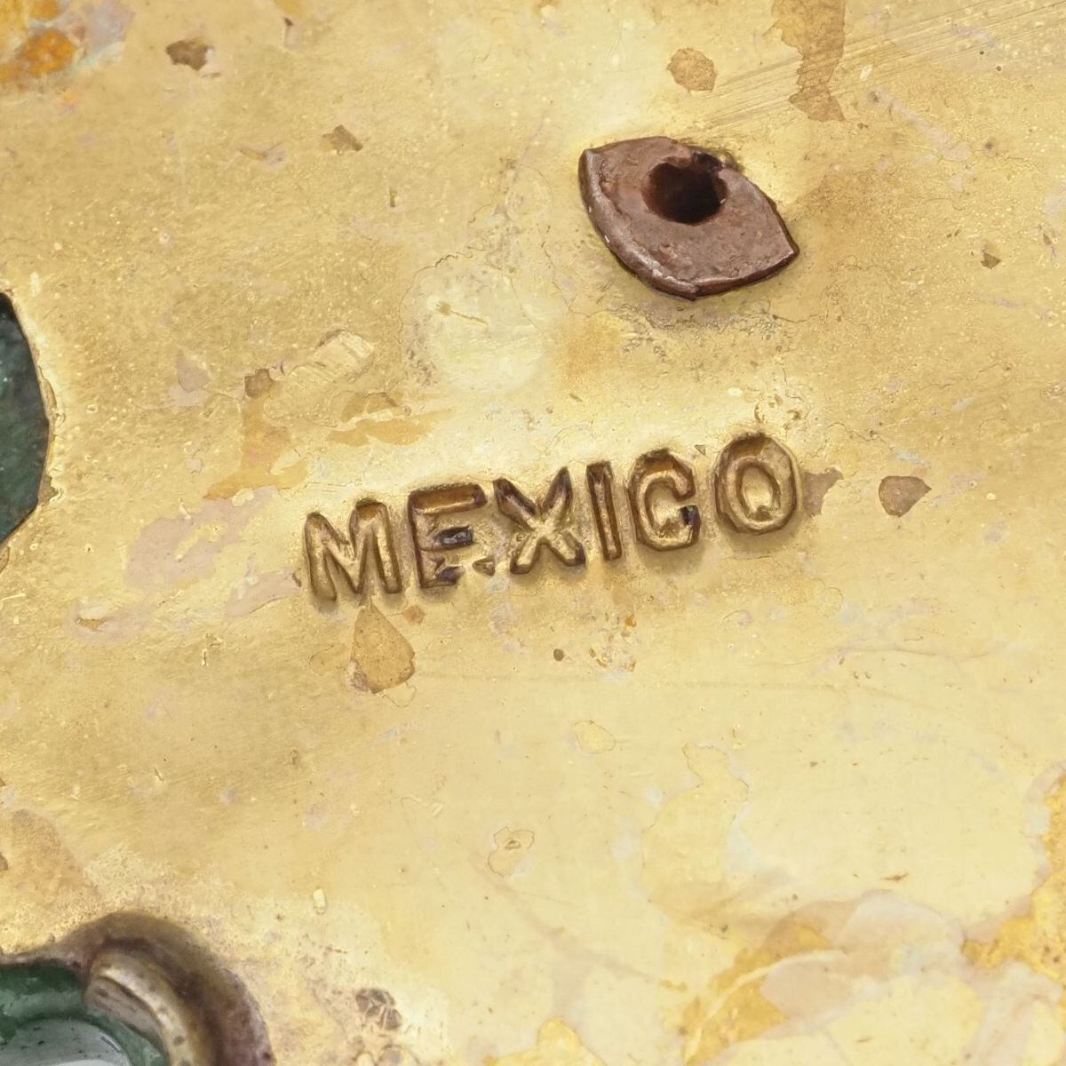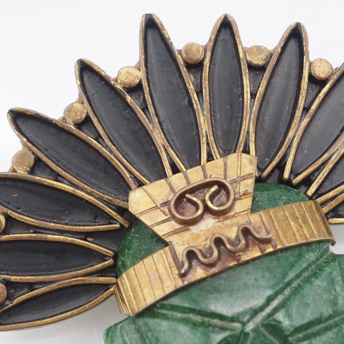 F350 グリーンストーン MEXICO刻印 ブローチ 大ぶり アステカ 民族 顔 ゴールド デザイン ヴィンテージ メキシコ製