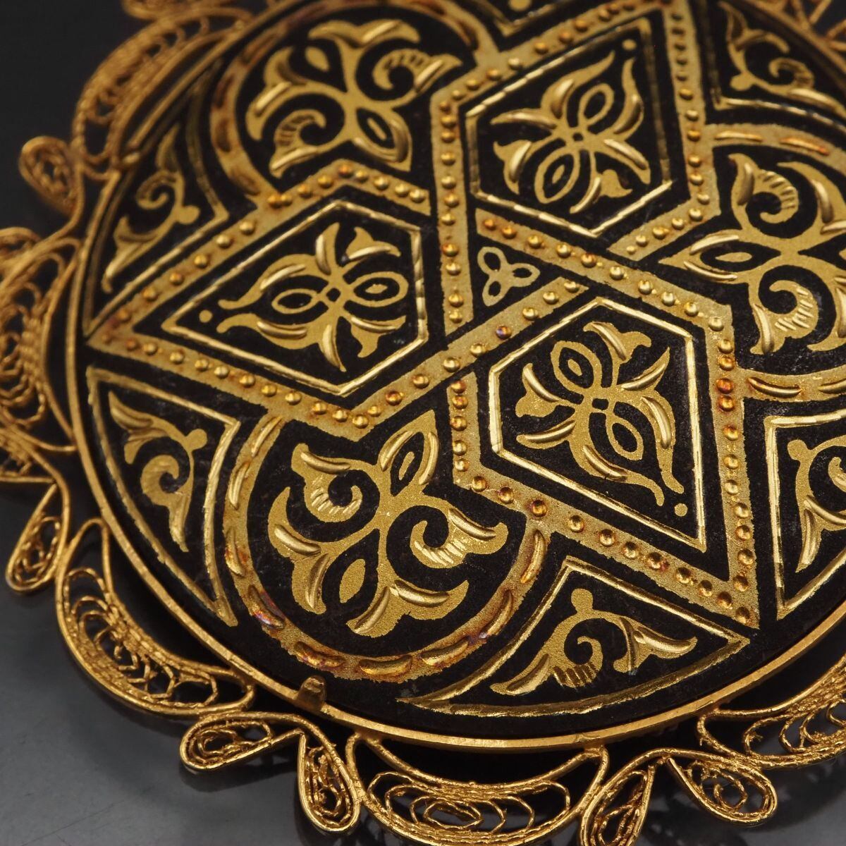 F308 金工 象嵌 ブローチ 幾何学模様柄 フィリグリー 銀線細工 ゴールド デザイン