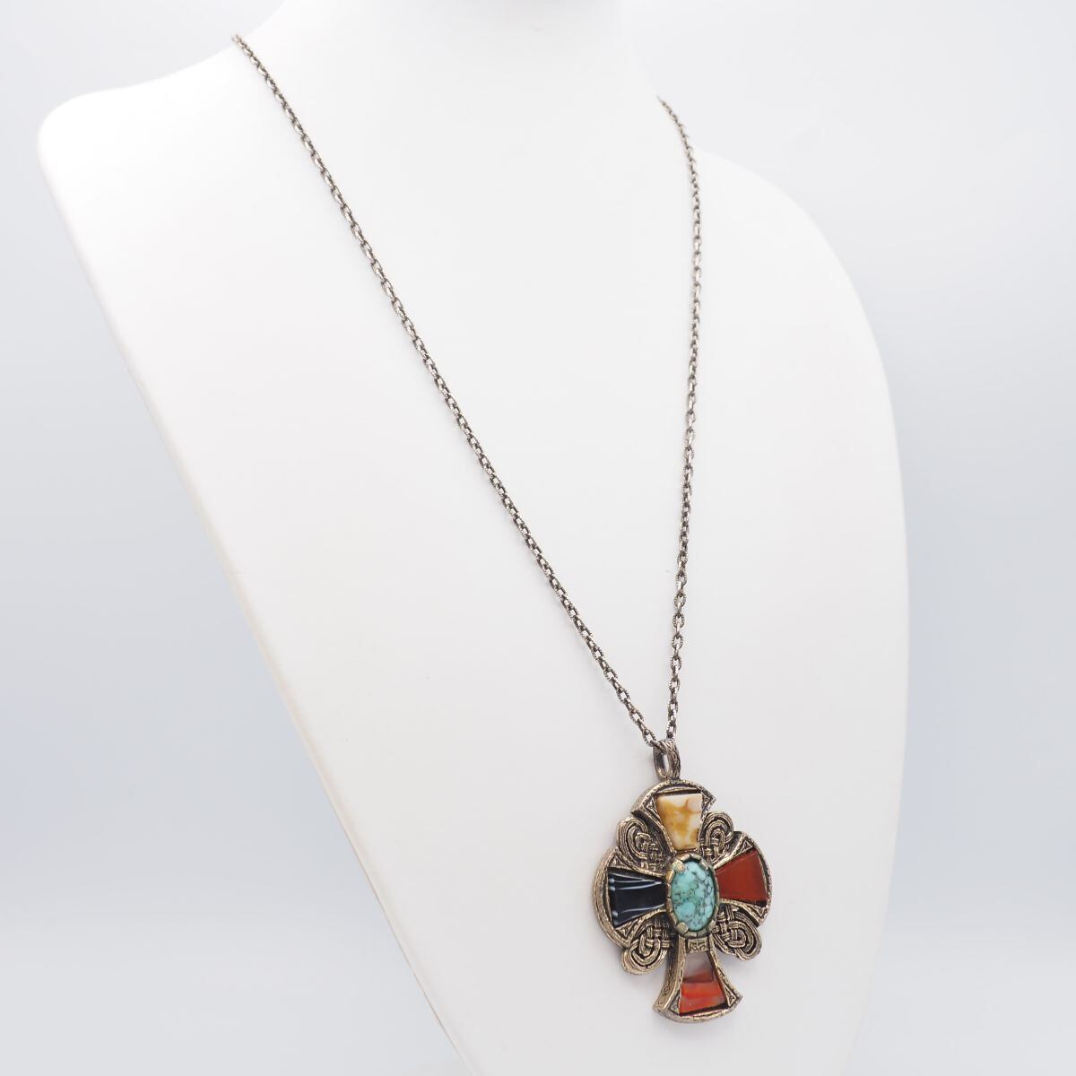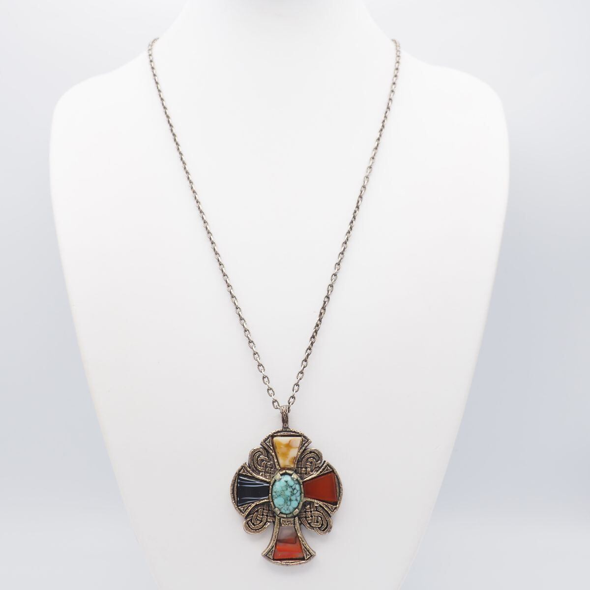 F646 イギリス ヴィンテージ MIRACLE ミラクル BRITAIN刻印 ペンダント ネックレス 大ぶり クロス 天然石風 デザイン 英国 アンティーク