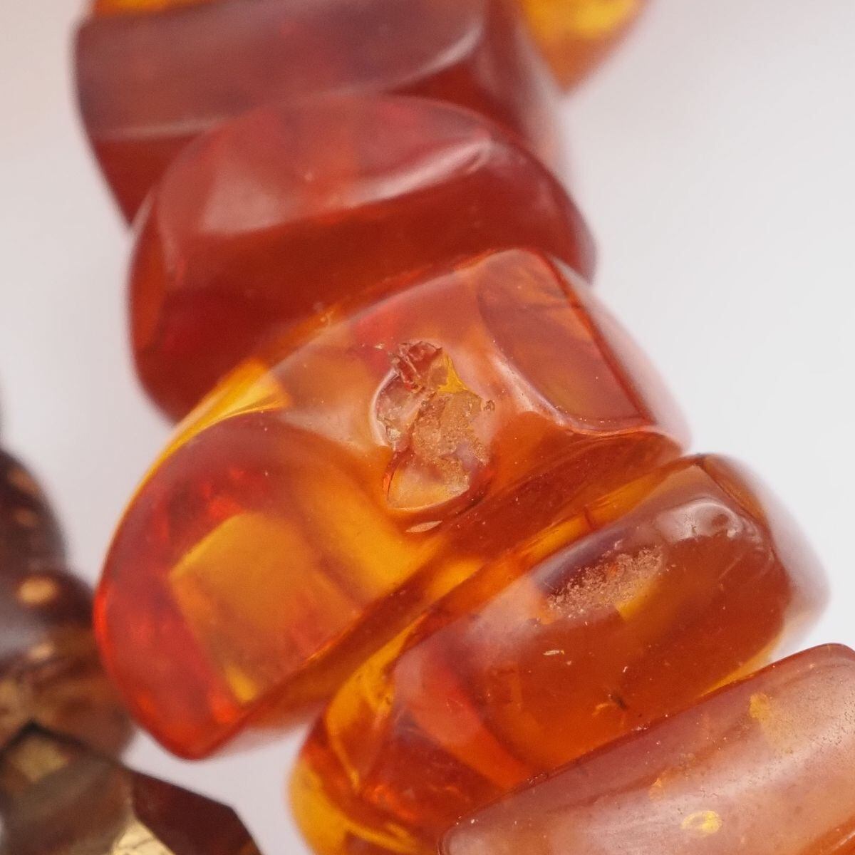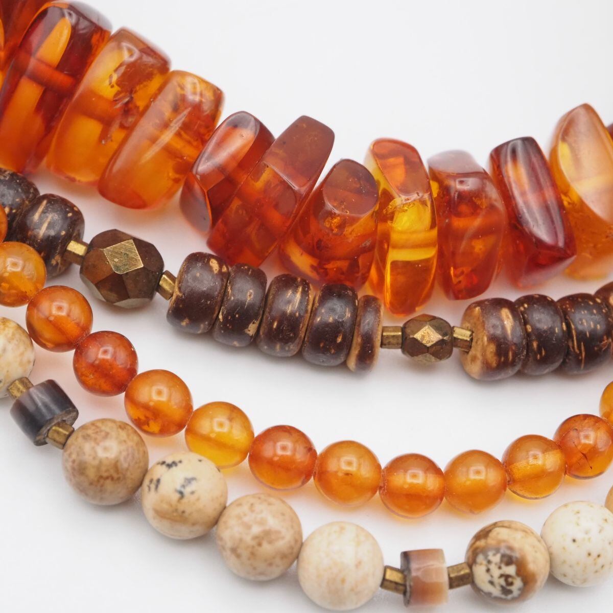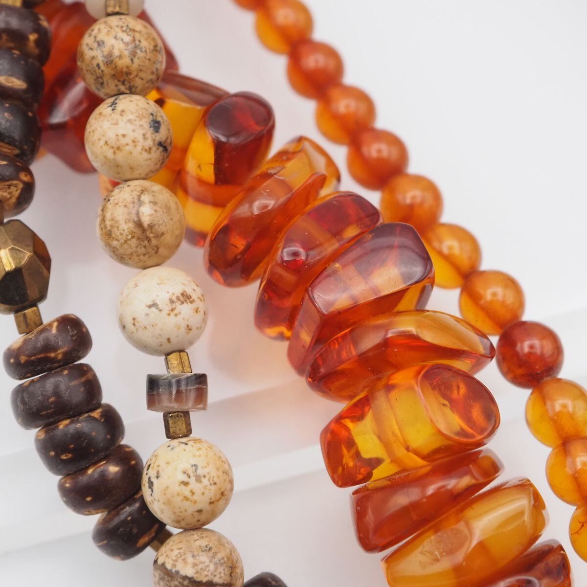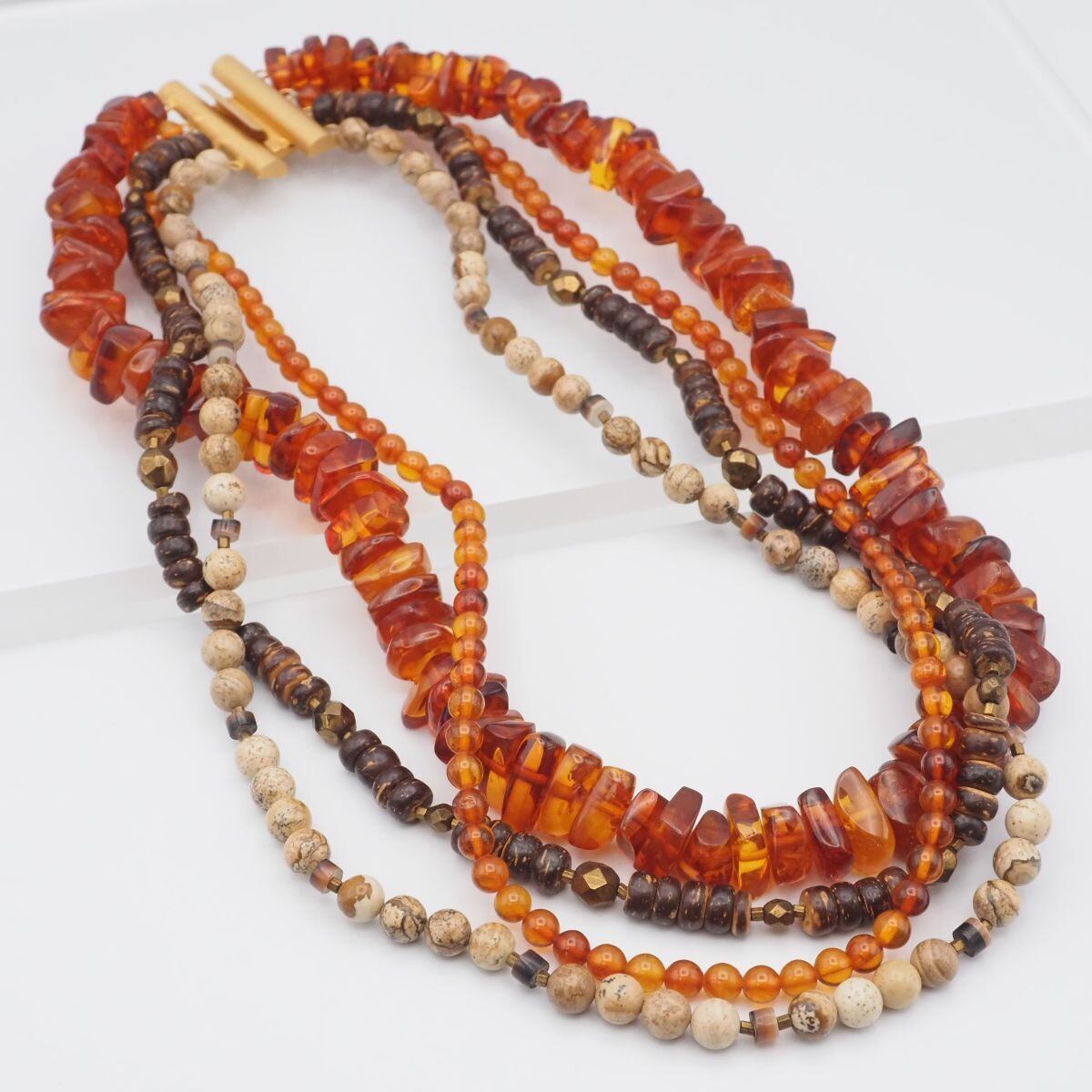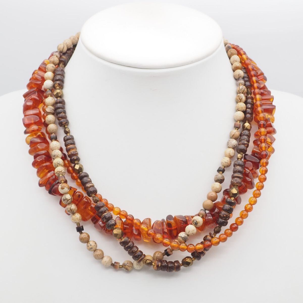 G384 琥珀 コハク アンバー 天然石 ネックレス 4連 木製 ゴールド デザイン