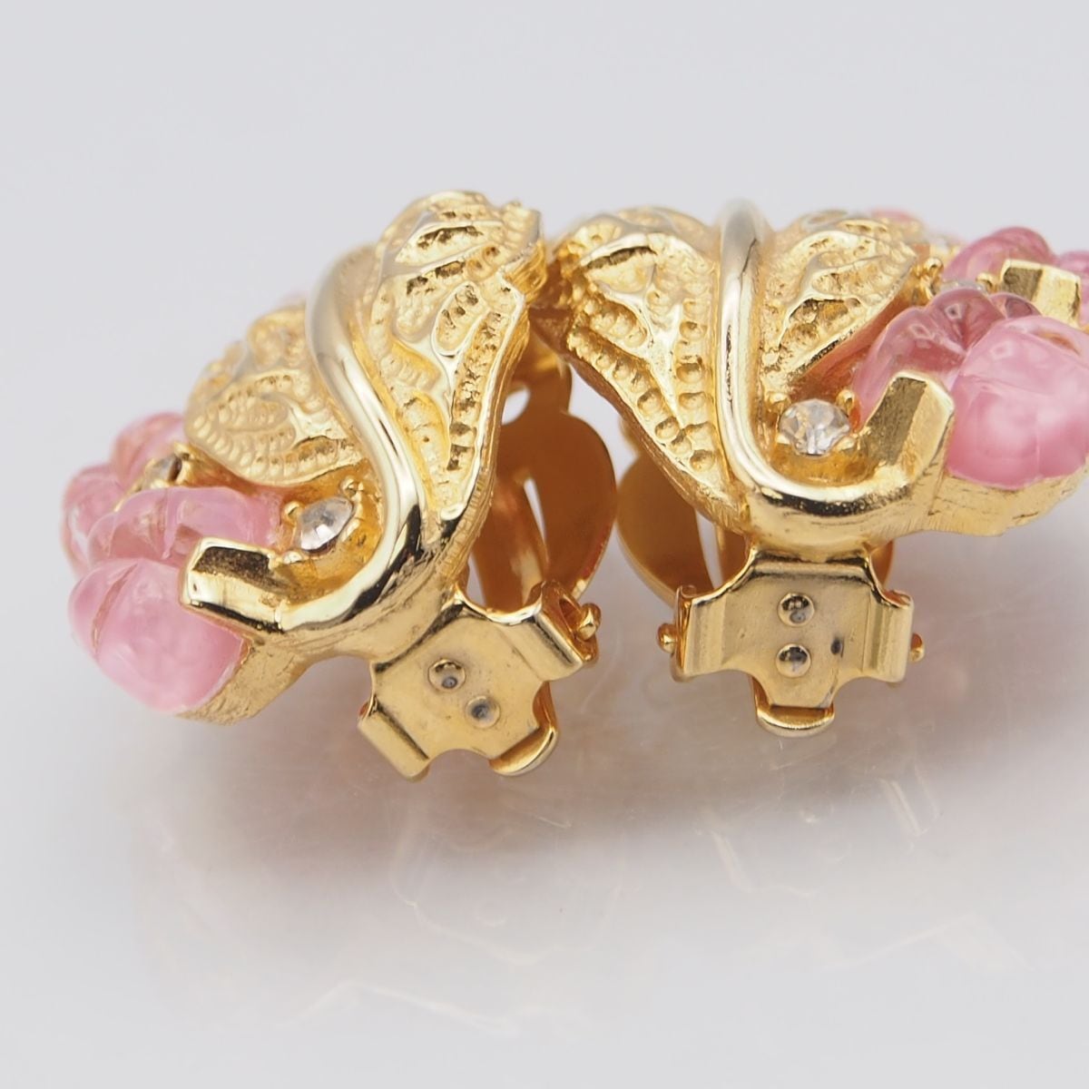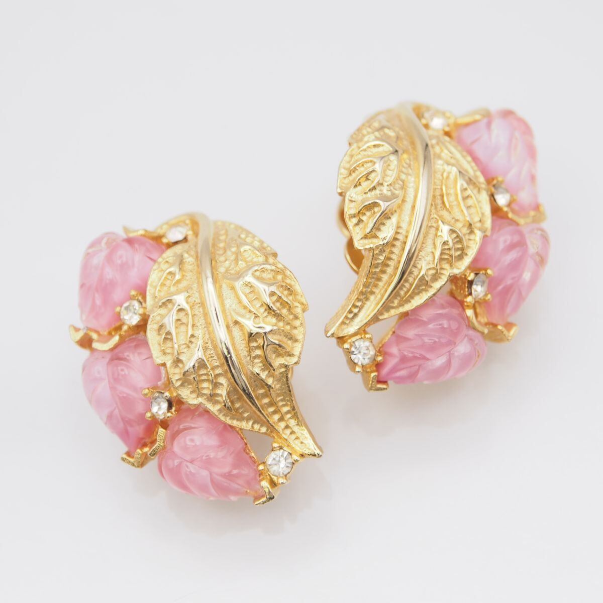 G075 イヤリング ピンクストーン風 ダイヤモンド風 リーフ ゴールド デザイン コスチュームジュエリー