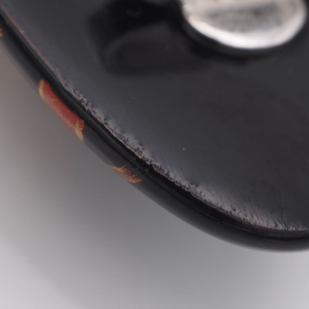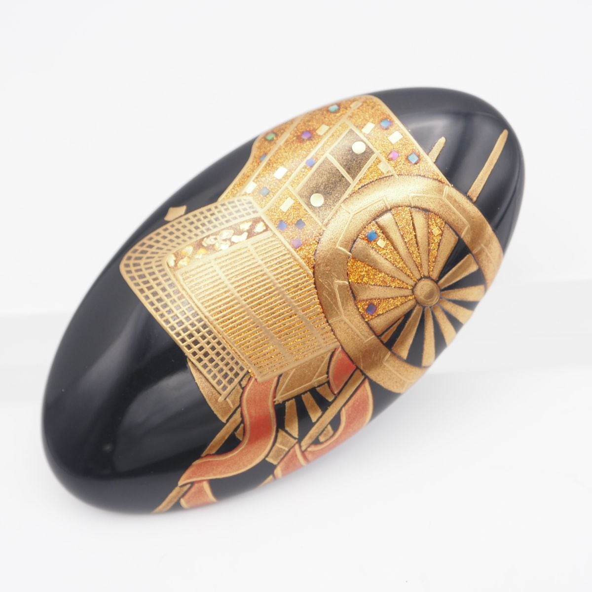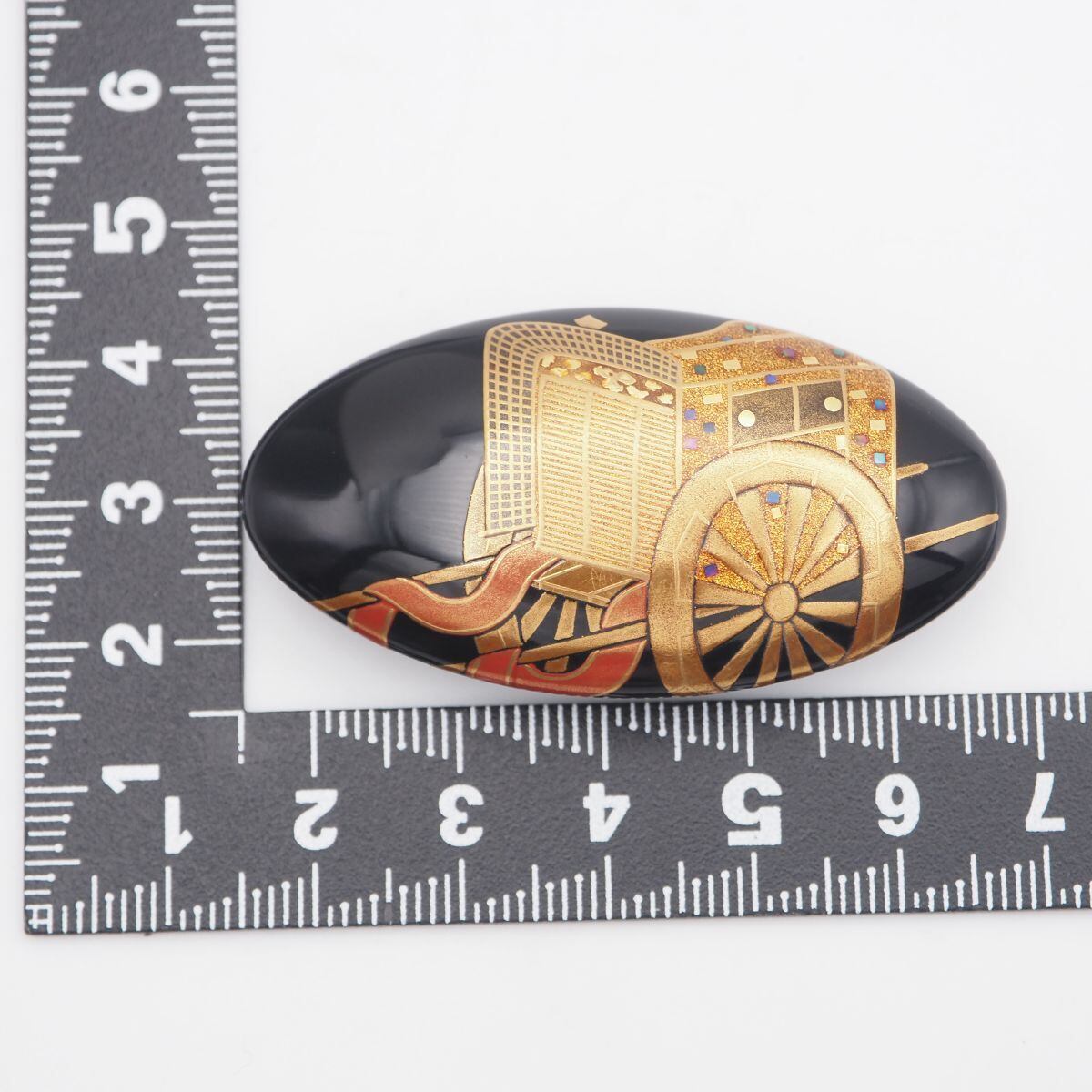 S764 木製 黒漆 帯留め 御所車 金彩 螺鈿細工 デザイン 和装小物