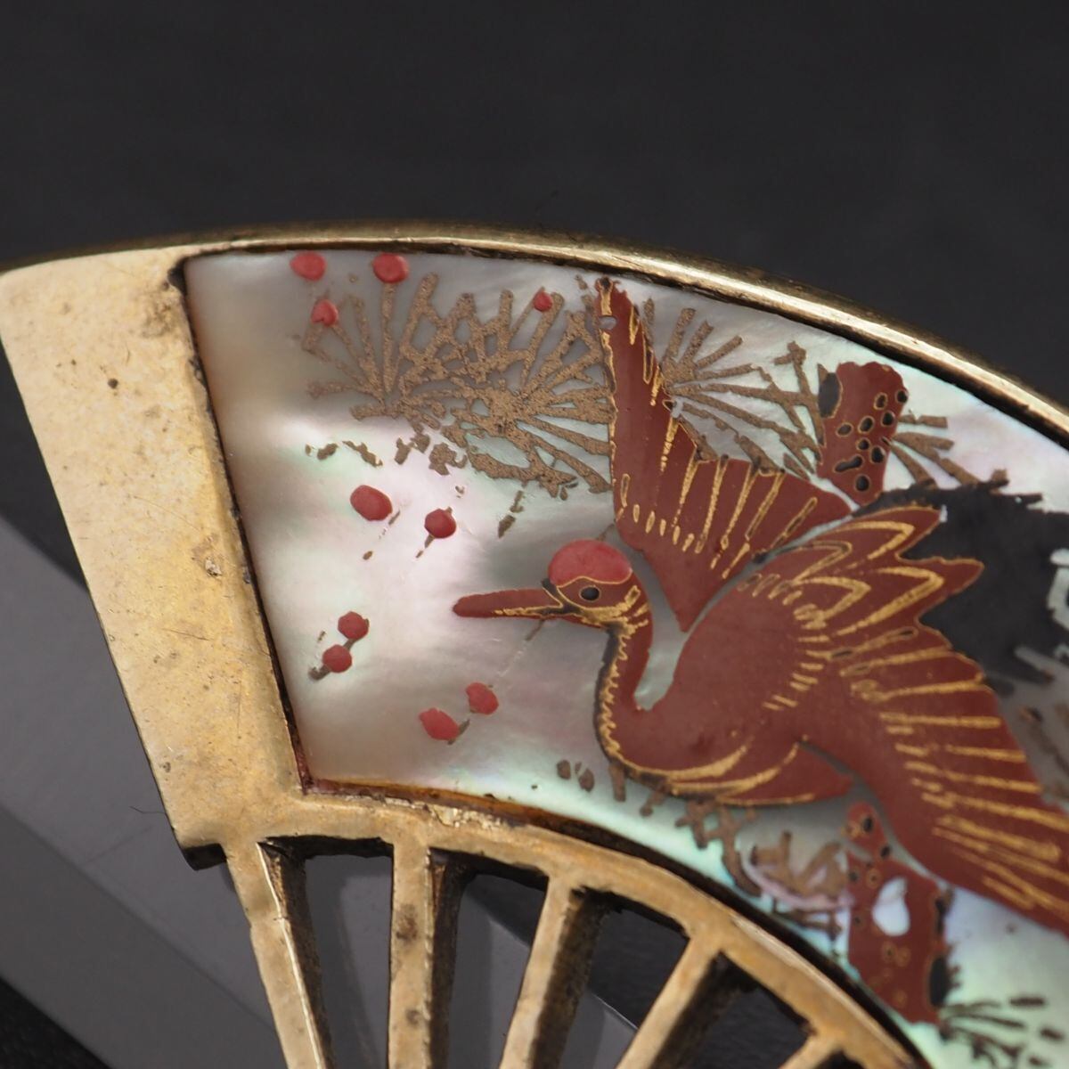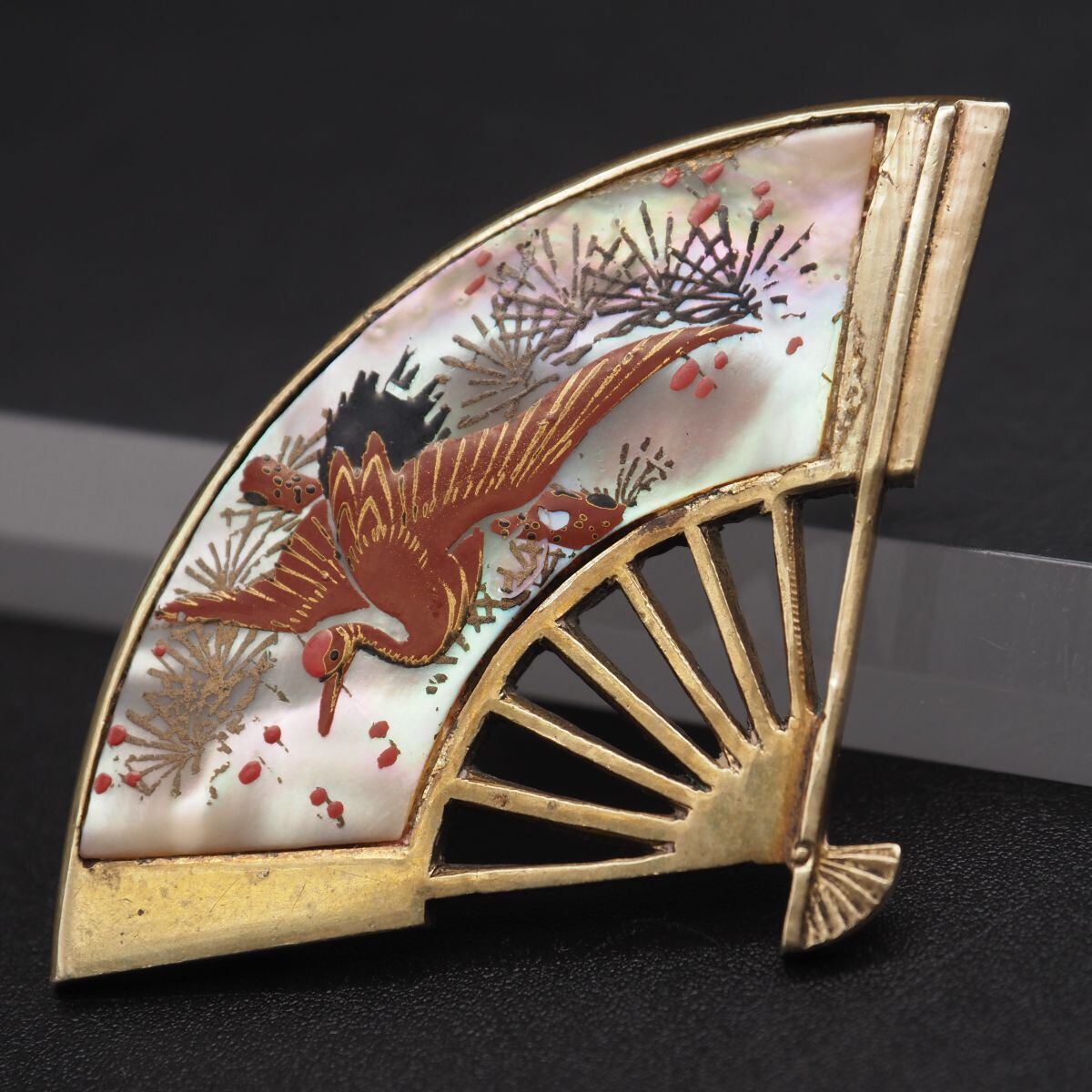S418 シェル ブローチ 扇子 鶴 ツル デザイン ゴールドカラー